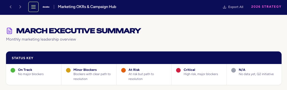 We also pull the pipeline updates into a bi-weekly marketing update for senior leadership at the company. Bridget Harvey, our support system/brilliant mind/ultimate chief of staff, built this other part. She pulls it all together with an always-on marketing command center, vibe-coded with love on Lovable, which includes campaign updates, OKRs, a calendar, pipeline data, etc.