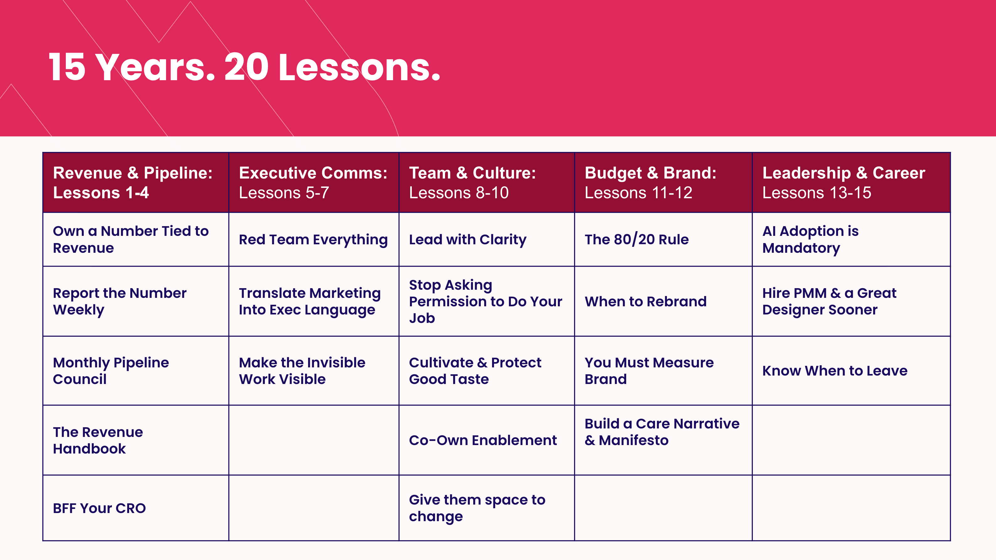 So, now we are back to the “Don’t Get Fired” series, which pulls from 20 lessons I’ve learned over the last 15 years running marketing teams.